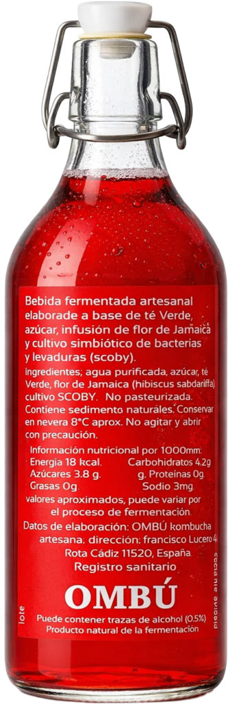 Bebida fermentada artesanal elaborada a base de té verde, azúcar, infusión de flor de hibisco y cultivo simbiótico de bacterias y levaduras (Scoby).